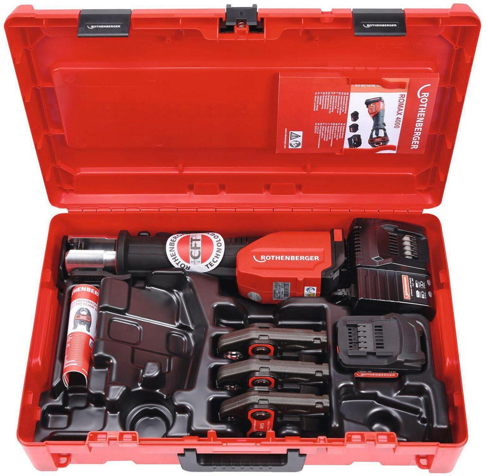Akku-Pressmaschine ROMAX 4000 Basic Set CAS Akku, Ladegerät, M 15, 22, 28 mm 4 Ah 32 - 34 kN 12 - 110 mm