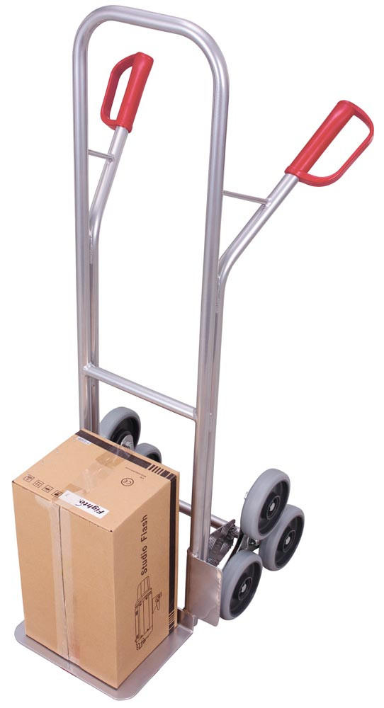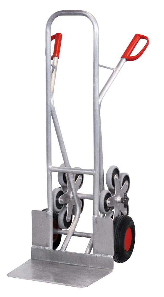 Alu-Treppenkarre, Schaufel-BxT 480x300 mm, BxTxH 570x580x1310 mm, Traglast 200 kg, Luftbereifung + 2 fünfarmige Radsterne Vollgummibereifung