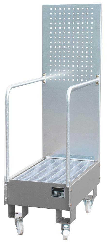 ∙ Mobiles, sicheres und einfaches Abfüllen von Ölen etc. an verschiedenen Verbrauchsstellen ∙ Auffangwanne aus 3 mm Stahlblech inkl. verzinktem, herausnehmbarem Gitterrost ∙ Traglast 1000 kg/m2 ∙ Stabile, verzinkte Stahlblechplatte mit Quadratlochung 10 x 10 mm, im fortlaufenden 38-mm-Raster für freie Positionierung von Werkzeughaltern ∙ Feuerverzinkte Schiebegriffe