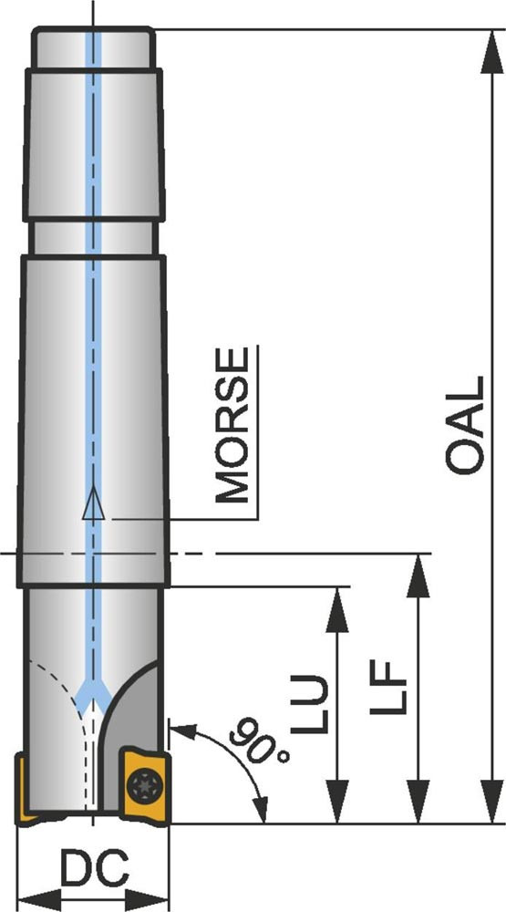 Eckfräser mit positiver/negativer Geometrie zum spannen von 3 Stück ADMX 11T3.. oder ADEX 11T3.. einseitigen Wendeschneidplatten · Schnittdurchmesser 20mm mit 90° Anstellwinkel und MK – Morsekegel Schaft gemäß DIN 228-1A · 30mm Funktionslänge 116mm Gesamtlänge · Kühlkanalbohrung zum Kopierfräsen · flachen Schulterfräsen · flachen Nutfräsen · Rampen · Helikalen Fräsen · Tauchfräsen und progressiven Eintauchen mit einer maximalen Schnitttiefe von 9.0mm