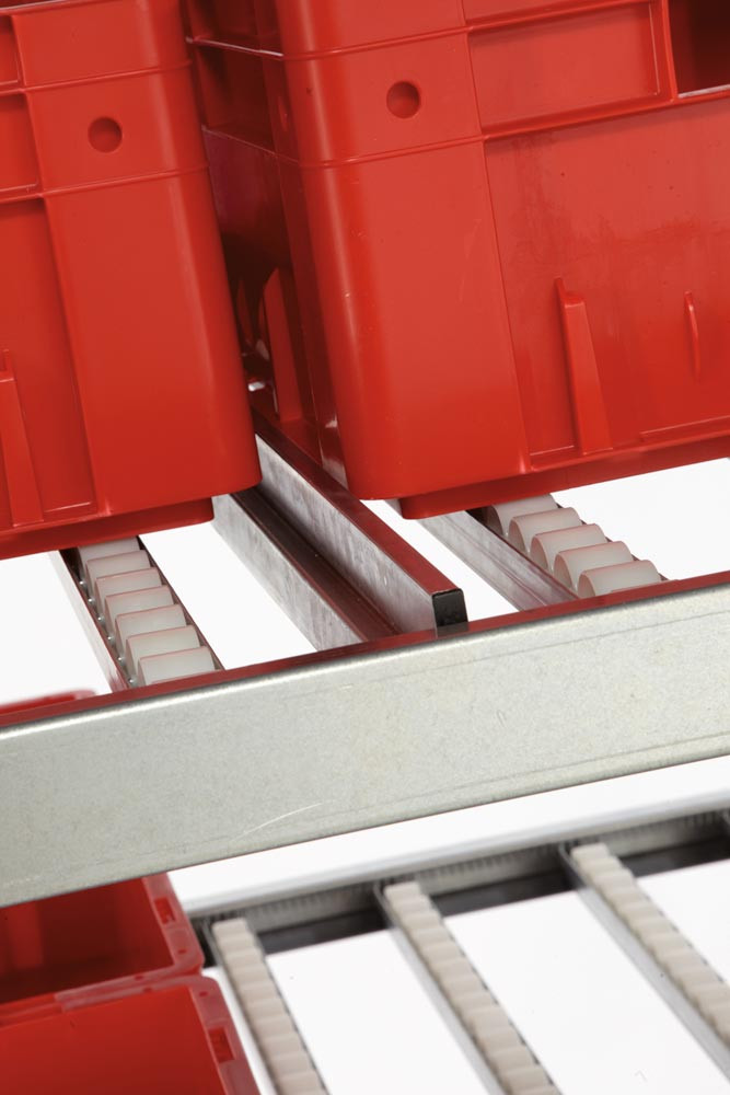 · Ideal für First-in-first-out-Lager, da Lagerware auf den Röllchenleisten nachrutschen kann ∙ Direkter Einblick und einfacher Zugriff durch Schrägstellung der Ebenen ∙ 4 Ebenen aus je 2 Quertraversen und 9 Röllchenleisten · Quertraversen dienen zur Aussteifung · Seitliche Begrenzung der Ebenen durch Tiefenriegel