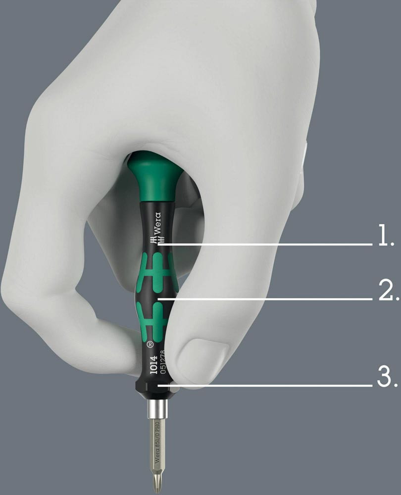 ermöglicht die individuelle Zusammenstellung unterschiedlichster Tool-Check Modular Elemente · für feinmechanische Verschraubungen · Bits-Handhalter für Bits mit 4 mm Außensechskantantrieb · Mehrkomponentiger Kraftform Micro Griff mit Abrollschutz und drehbarer Kappe · Kraftzone mit integrierten Weichzonen für Übertragung hoher Löse- und Anzugsmomente
