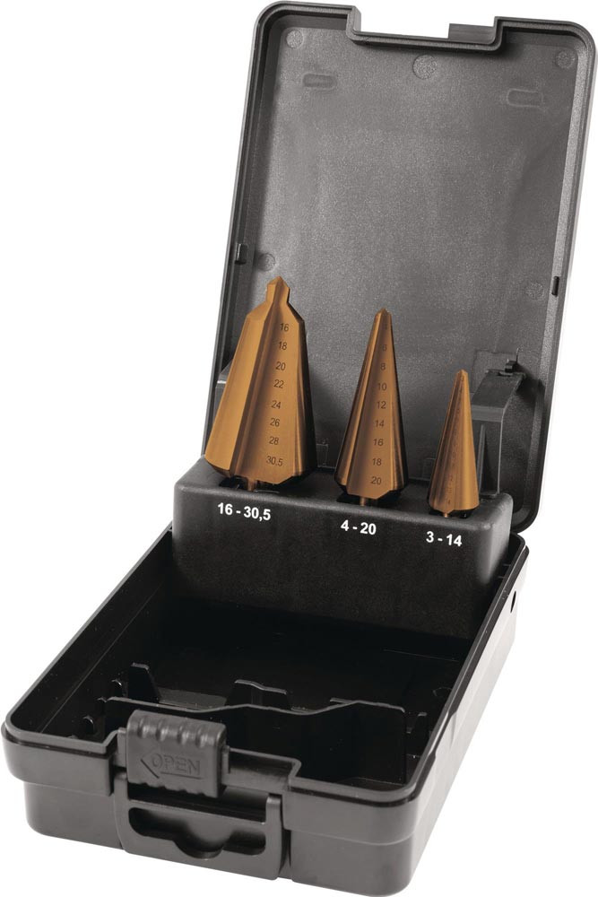 Blechschälbohrersatz 3-14/4-20/16-30,5 mm HSS-TiN 3 teilig Kunststoffkassette