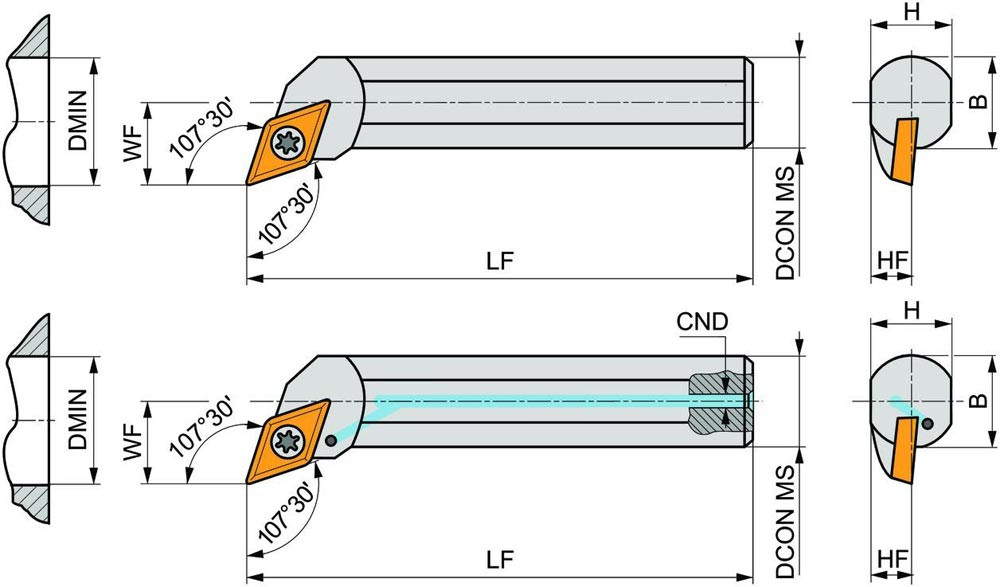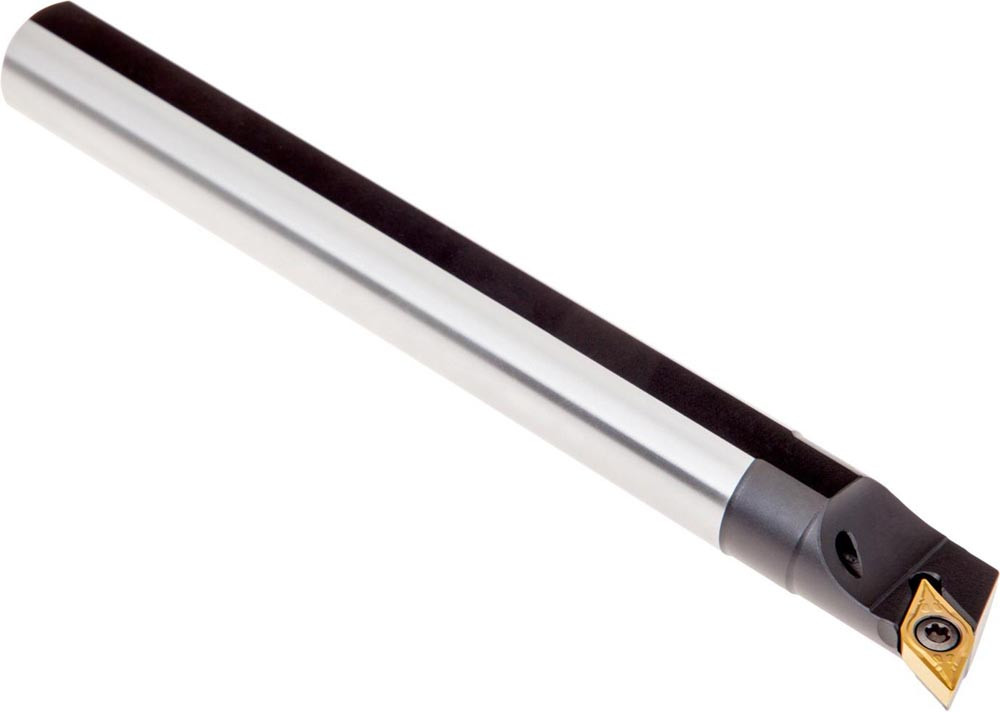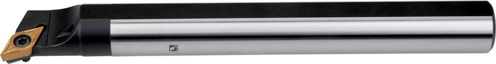 Dreh-Bohrstange mit Schraubklemmung zum spannen von 55° Rhombus positive Wendeschneidplatten mit einem Innenkreisdurchmesser von 6.35mm · 2.38mm Dick (ISO Bezeichnung DC.. 0702.. ) · rechte Ausführung zum 107°30' Längsdrehen mit abgesetzem Schaft · Stahl mit Kühlkanalbohrung · 16mm Durchmesser x 150mm Länge für Innenkegeldrehen und Längsdrehen mit und ohne Schulter