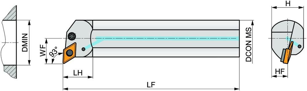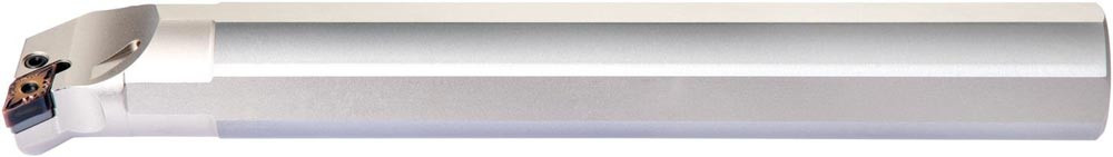 Dreh-Bohrstange mit Kniehebelklemmung zum spannen von 55° Rhombus negative Wendeschneidplatten mit einem Innenkreisdurchmesser von 15.875mm · 6.35mm Dick (ISO Bezeichnung DN.. 1506.. ) · rechte Ausführung zum 93° Längsdrehen mit abgesetzem Schaft · Stahl mit Kühlkanalbohrung · 40mm Durchmesser x 300mm Länge für Innenkegeldrehen · Kopierdrehen in einer und mehreren Richtungen und Längsdrehen mit und ohne Schulter