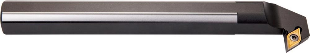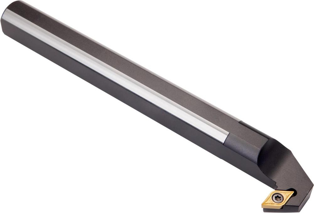 Dreh-Bohrstange mit Schraubklemmung zum spannen von 55° Rhombus positive Wendeschneidplatten mit einem Innenkreisdurchmesser von 9.525mm · 3.97mm Dick (ISO Bezeichnung DC.. 11T3.. ) · linke Ausführung zum Rückwärtsdrehen mit abgesetzem Schaft · Stahl ohne Kühlkanalbohrung · 32mm Durchmesser x 250mm Länge für Rückwärtsentgraten
