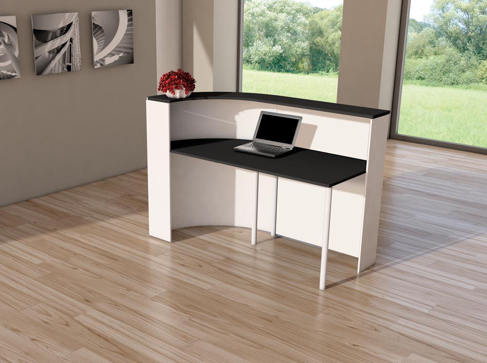 ∙ Stahl-/Holzkonstruktion ∙ Thekenkörper aus Metall in weiß mit dekorativen Edelstahlstreifen ∙ Melaminharzbeschichtete Holzplatten mit ABS-Kante in anthrazit ∙ Kabeldurchlässe in der Arbeitsplatte ∙ Hinter den 1100 mm hohen Fronten befindet sich ein vollwertiger Arbeitsplatz mit einer Tiefe von 800 mm und einer Höhe von 740 mm ∙ Beliebig erweiterbar durch Anbauelement