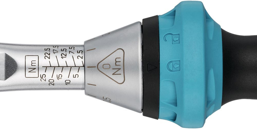 mit Umschaltknarre · für Rechtsgang · automatische, deutlich hör- und spürbare Kurzwegeauslösung beim Erreichen des vorgewählten Drehmomentes · Auslösegenauigkeit ± 3 % vom eingestellten Skalenwert (in Betätigungsrichtung) · Befestigungsmöglichkeit für Seilschlaufe durch Öffnungen am Verriegelungs-Drehkranz · dauerhafte Lesbarkeit durch Laserbeschriftung der Skalenhülse · Abrollschutz · Einstellhilfe durch Rastpunkte gewährleistet sicheres und schnelles Einstellen des gewünschten Drehmomentwertes durch Drehen des Griffes · 2-Komponentengriff · Schloss-Symbole signalisieren den jeweiligen Verriegelungszustand