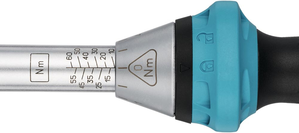 mit Umschaltknarre · für Rechtsgang · automatische, deutlich hör- und spürbare Kurzwegeauslösung beim Erreichen des vorgewählten Drehmomentes · Auslösegenauigkeit ± 3 % vom eingestellten Skalenwert (in Betätigungsrichtung) · Befestigungsmöglichkeit für Seilschlaufe durch Öffnungen am Verriegelungs-Drehkranz · dauerhafte Lesbarkeit durch Laserbeschriftung der Skalenhülse · Abrollschutz · Einstellhilfe durch Rastpunkte gewährleistet sicheres und schnelles Einstellen des gewünschten Drehmomentwertes durch Drehen des Griffes · 2-Komponentengriff · Schloss-Symbole signalisieren den jeweiligen Verriegelungszustand