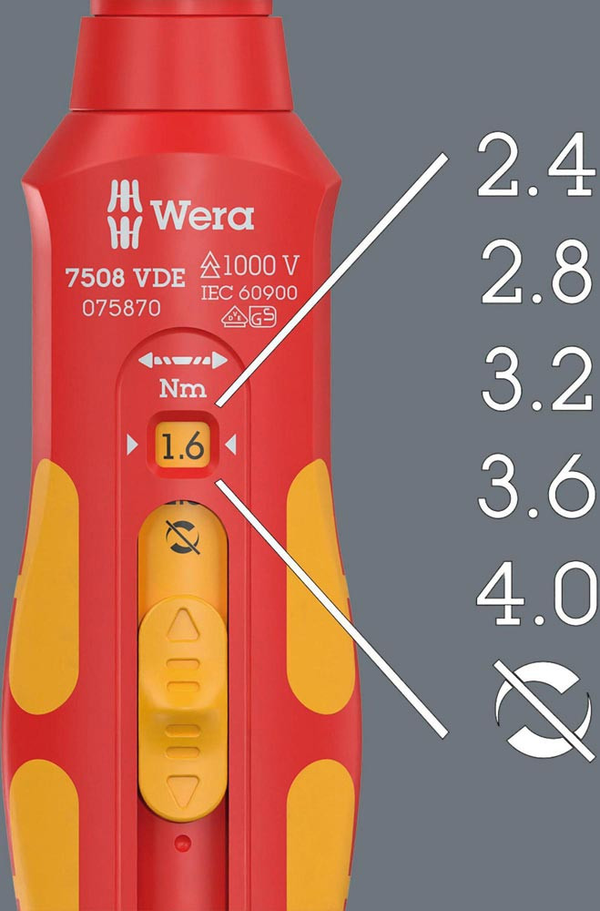VDE-isolierter Drehmomentschraubendrehergriff mit 9 mm Sechskantaufnahme · ausschließlich für Wera Kraftform Kompakt VDE Wechselklingen · für professionelles Schrauben/Feinjustage UND für drehmomentkontrolliertes Schrauben · überrutschende, nicht überziehbare Drehmomentfunktion für Rechts-/ Linksanzug · mit fünf wählbaren Anzugsdrehmomenten Rechts/Links (Art.-Nr. 6500994: 0,4 · 0,8 · 1,2 · 1,6 · 2,0 Nm bzw. Art.-Nr. 6500995: 2,4 · 2,8 · 3,2 · 3,6 · 4,0 Nm), die extrem schnell eingestellt werden können · eine Fest-Stellung (Torque Lock) für unbegrenzte Löse-/Anzugsmomente · mit Freilaufhülse für eine gute Führung des Werkzeugs während des Schraubvorgangs