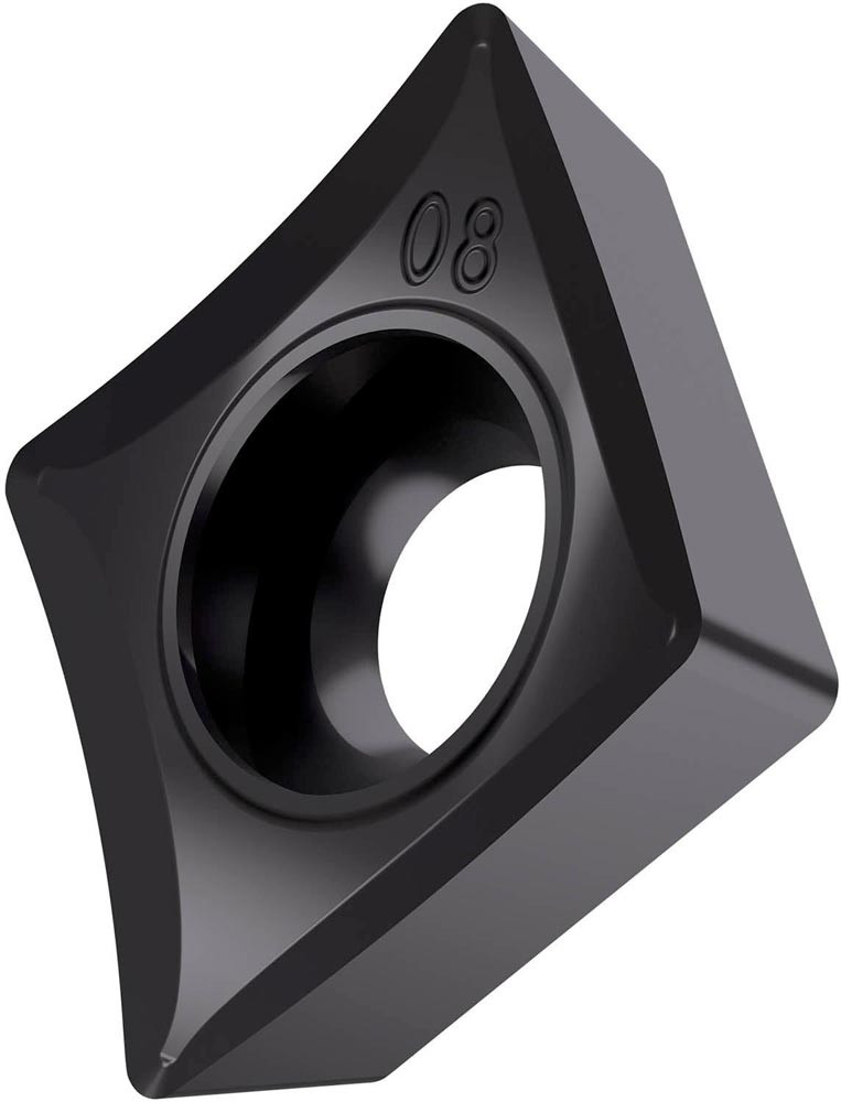 Einseitige positive Drehwendeschneidplatte · 80° Rhombisch mit 7° Freiwinkel · Innenkreisdurchmesser von 9.525mm · 3.97mm Dick · 0.8mm Radius · Indexgenauigkeit nach ISO-Toleranzklasse-G · Spanbrecher NF1 mit verrundeter Schneidkante · im Substrat T7325 · MT-CVD beschichtet functionally graded WC-Co carbide in den ISO-Bereichen M10 -M25 und S10 -S25 · zum schlichten bis medium bearbeiten von nichtrostenden Stählen und Superlegierungen