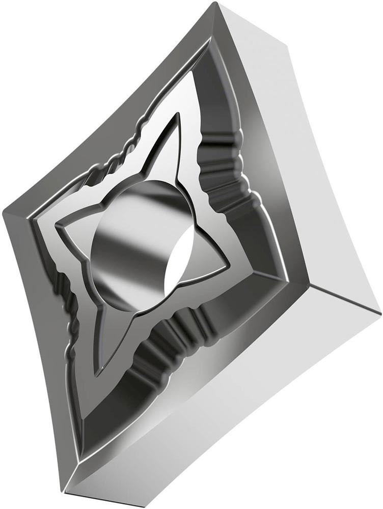 Doppelseitige negative Drehwendeschneidplatte · 80° Rhombisch mit Innenkreisdurchmesser von 12.7mm · 4.76mm Dick · 0.2mm Radius · Indexgenauigkeit nach ISO-Toleranzklasse-G · Spanbrecher SF mit verrundeter Schneidkante · im Substrat T8430 · PVD beschichtet WC-Co Feinkornsubstrat in den ISO-Bereichen P20 -P40 und M20 -M35 · zum schlichten bis medium bearbeiten von Stählen und nichtrostenden Stählen