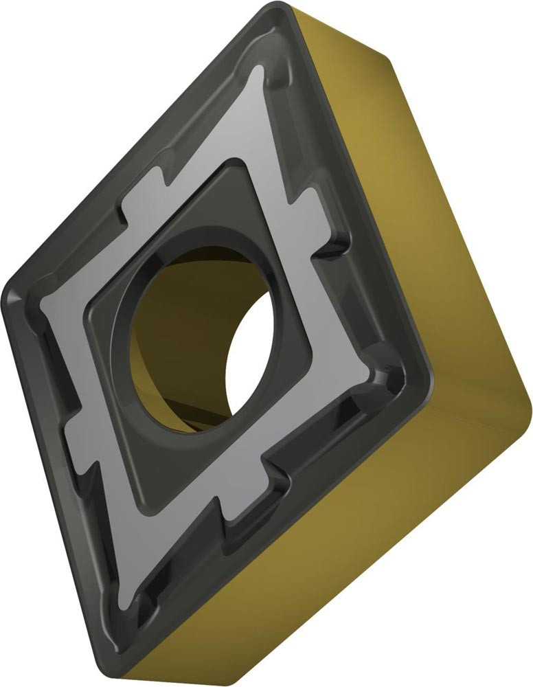 Doppelseitige negative Drehwendeschneidplatte · 80° Rhombisch mit Innenkreisdurchmesser von 19.05mm · 6.35mm Dick · 0.8mm Radius · Indexgenauigkeit nach ISO-Toleranzklasse-M · Spanbrecher M mit verrundeter Schneidkante · im Substrat T9415 · MT-CVD beschichtet WC-Co Substrat im ISO-Bereich P05 -P30 · zum schlichten bis schruppen bearbeiten von Stählen