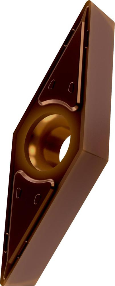 Einseitige positive Drehwendeschneidplatte · 35° Rhombisch mit 5° Freiwinkel · Innenkreisdurchmesser von 9.525mm · 4.76mm Dick · 0.4mm Radius · Indexgenauigkeit nach ISO-Toleranzklasse-M · Spanbrecher FF2 mit verrundeter Schneidkante · im Substrat T8430 · PVD beschichtet WC-Co Feinkornsubstrat im ISO-Bereich P20 -P40 · zum schlichten bis medium bearbeiten von Stählen