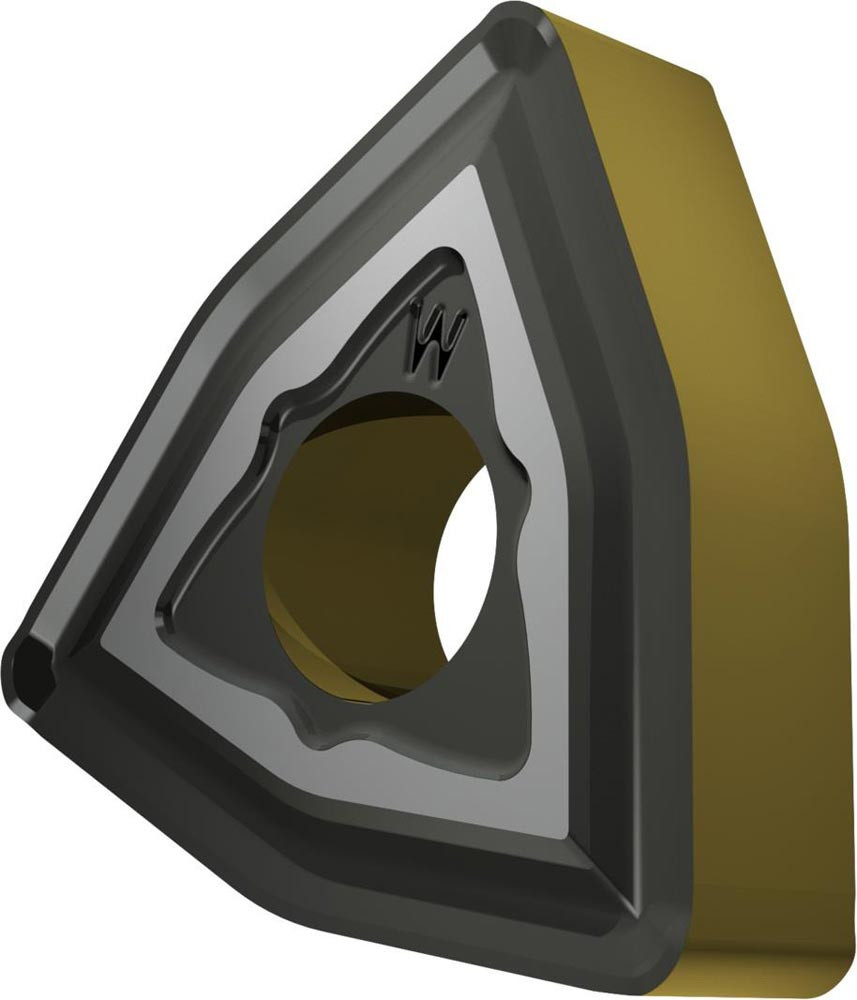 Doppelseitige negative Drehwendeschneidplatte · 80° Trigon mit Innenkreisdurchmesser von 12.7mm · 4.76mm Dick · 1.2mm Radius · Indexgenauigkeit nach ISO-Toleranzklasse-M · Spanbrecher MR mit Wiper-Geometrie · im Substrat T9415 · MT-CVD beschichtet WC-Co Substrat im ISO-Bereich P05 -P30 · zum medium bis schruppen bearbeiten von Stählen