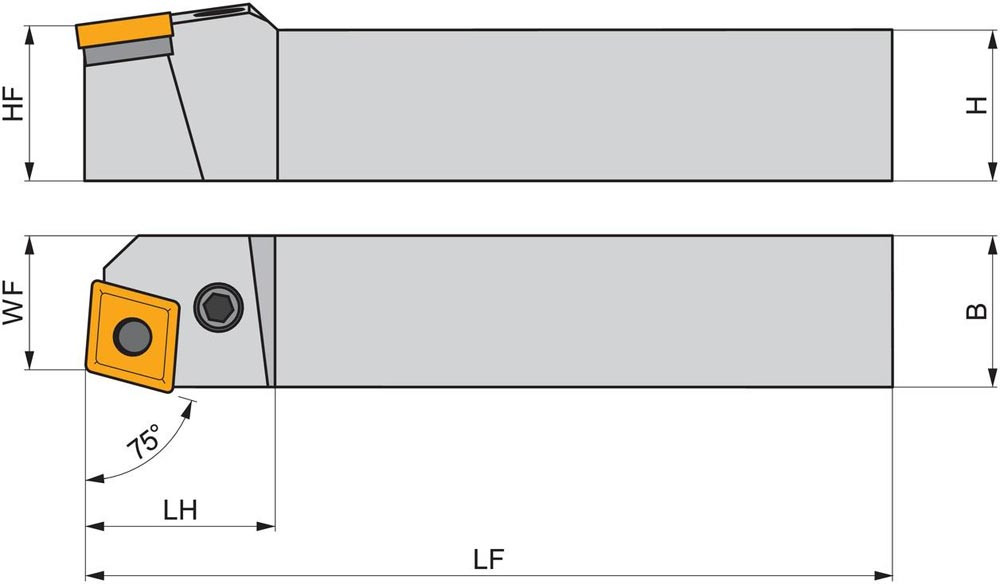 Dreh-Trägerwerkzeug mit Kniehebelklemmung zum spannen von 80° Rhombus negative Wendeschneidplatten mit einem Innenkreisdurchmesser von 15.575mm · 6.35mm Dick (ISO Bezeichnung CN.. 1606.. ) · linke Ausführung zum 75° Stirndrehen mit Zylinderschaft · 32mm Werkzeughöhe x 32mm Breite x 170mm Länge für Kegeldrehen und Längsdrehen ohne Schulter