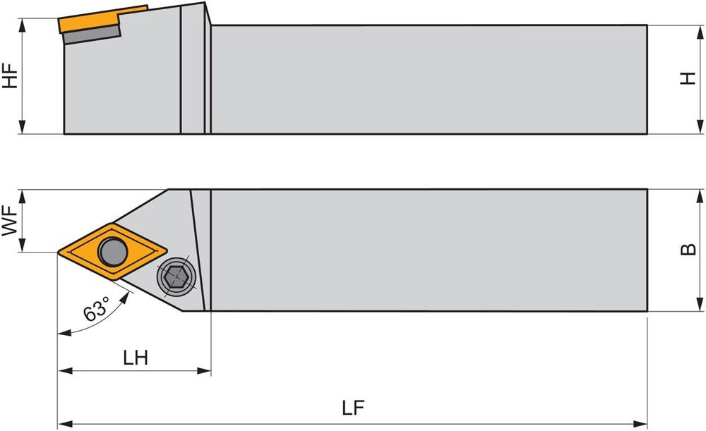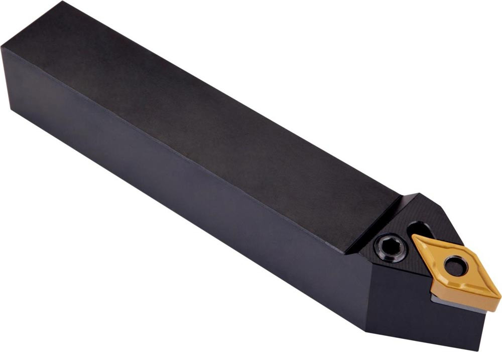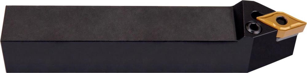Dreh-Trägerwerkzeug mit Kniehebelklemmung zum spannen von 55° Rhombus negative Wendeschneidplatten mit einem Innenkreisdurchmesser von 9.525mm · 4.76mm Dick (ISO Bezeichnung DN.. 1104.. ) · linke Ausführung zum 62°30' Stirndrehen mit Zylinderschaft · 25mm Werkzeughöhe x 25mm Breite x 150mm Länge für Kopierdrehen in einer und mehreren Richtungen