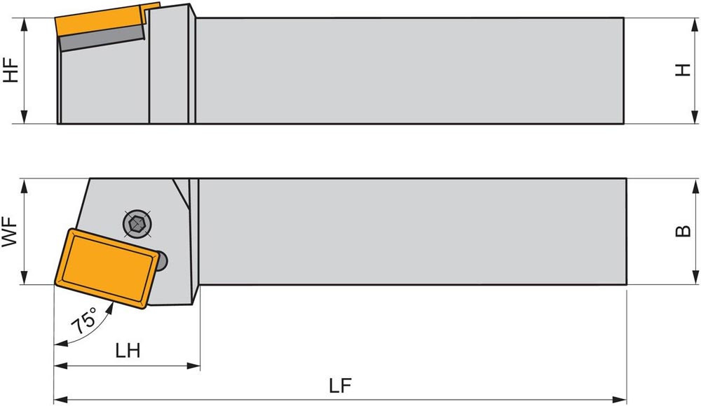 Dreh-Trägerwerkzeug mit Kniehebelklemmung zum spannen von Rechteckig negative Wendeschneidplatten mit einer Hauptschneidenlänge von 40mm (ISO Bezeichnung LNUX 40.... ) · rechte Ausführung zum 75° Stirndrehen mit Zylinderschaft · 60mm Werkzeughöhe x 60mm Breite x 400mm Länge für Kegeldrehen und Längsdrehen ohne Schulter