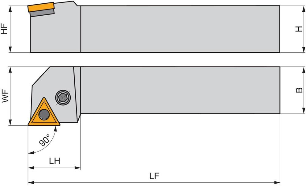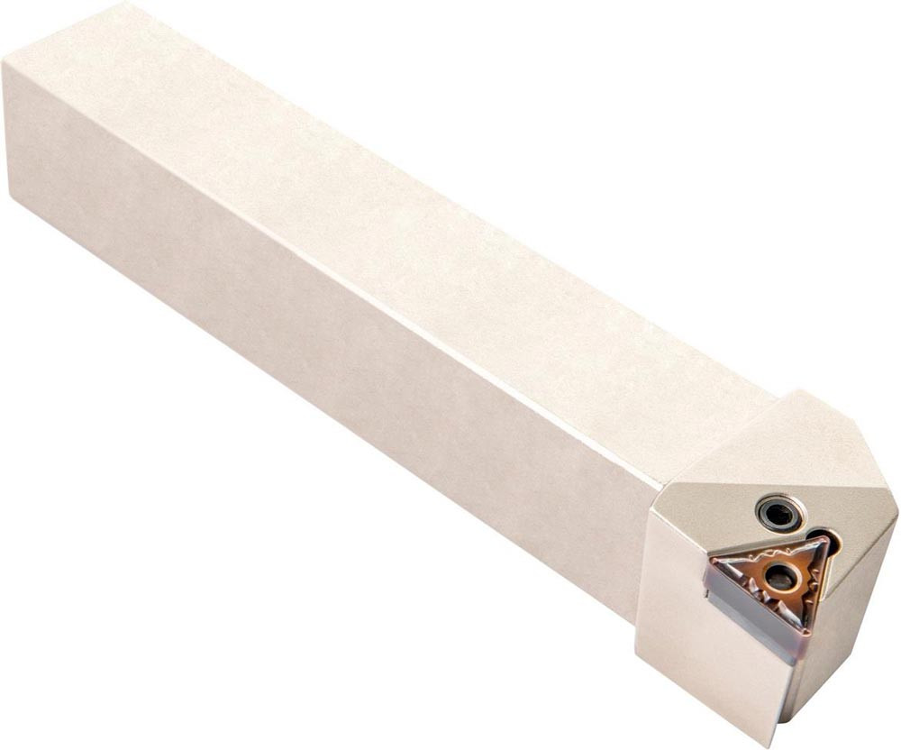 Dreh-Trägerwerkzeug mit Kniehebelklemmung zum spannen von Triangular negative Wendeschneidplatten mit einem Innenkreisdurchmesser von 9.525mm · 4.76mm Dick (ISO Bezeichnung TN.. 1604.. ) · linke Ausführung zum 90° Stirndrehen mit abgesetzem Schaft · 20mm Werkzeughöhe x 20mm Breite x 125mm Länge für Kegeldrehen und Längsdrehen ohne Schulter