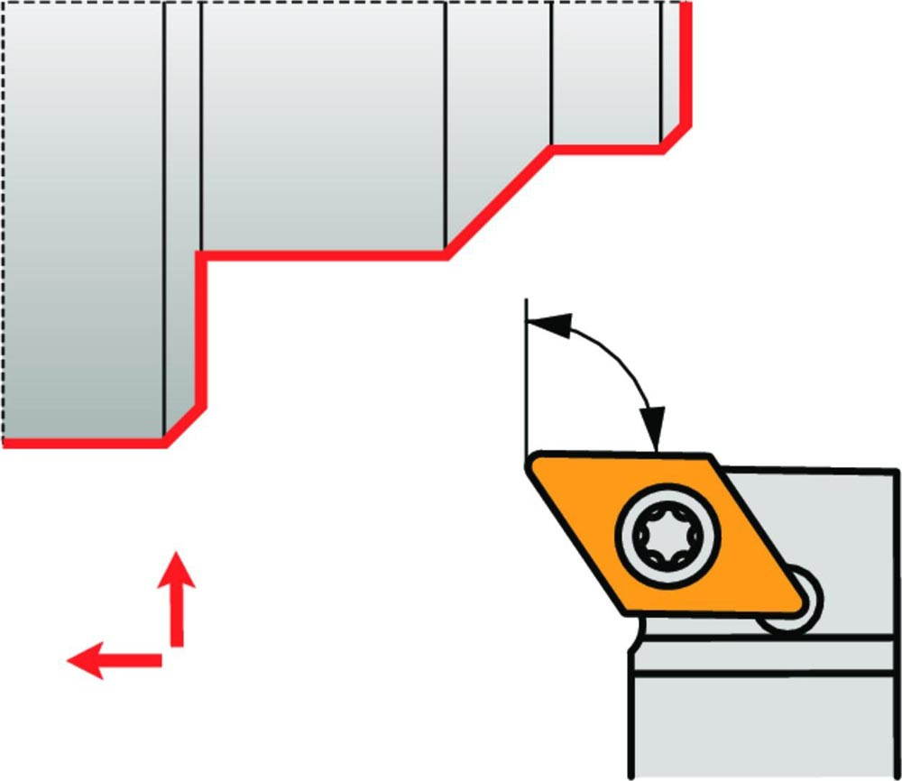 Drehmeißel mit Schraubklemmung · auch kompatibel für Langdrehautomaten zum spannen einer 55° Rhombisch positive Wendeschneidplatte mit einem Inkreisdurchmesser von 9.525mm · 3.97mm Dicke (ISO Bezeichnung DC.. 11T3.. ) · rechte Ausführung 90° Stirndrehen mit abgesetztem Schaft · 16mm Schaft Höhe x 16mm Breite x 125mm Länge zum Kegeldrehen und Längsdrehen mit und ohne Schulter