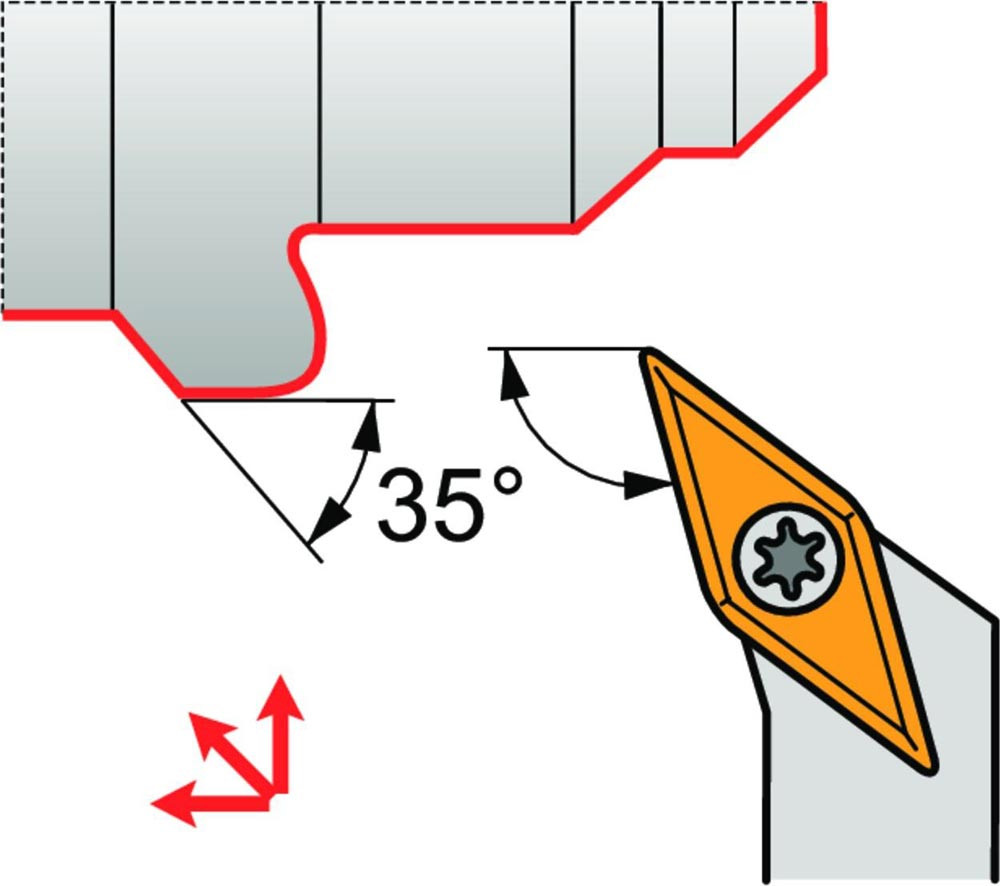 Dreh-Trägerwerkzeug mit Schraubklemmung zum spannen von 35° Rhombus positive Wendeschneidplatten mit einem Innenkreisdurchmesser von 9.525mm · 4.76mm Dick (ISO Bezeichnung VB.. 1604.. oder VC.. 1604.. ) · linke Ausführung zum 107°30' Stirndrehen mit abgesetzem Schaft · 25mm Werkzeughöhe x 25mm Breite x 150mm Länge für Kegeldrehen · Kopierdrehen in einer und mehreren Richtungen und Längsdrehen mit und ohne Schulter