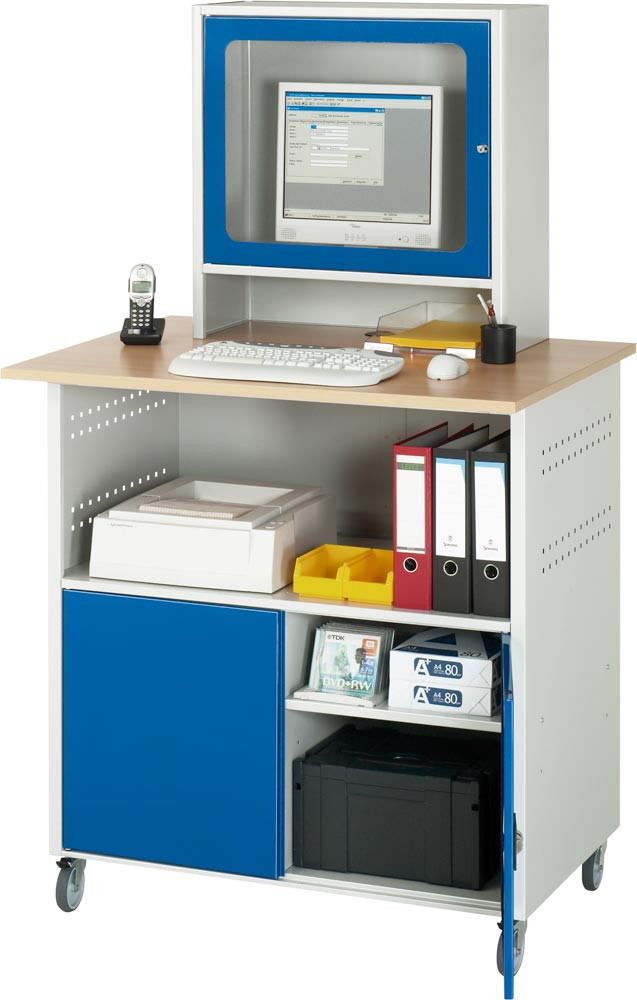· Buche-Dekor-Arbeitsplatte (Stärke 22 mm) mit Kabeldurchlass ·Basisschrank (B x T x H 1100 x 630 x 1035 mm) oben mit offenem Ablagefach (H 415 mm) und unten mit Flügeltürfach (H 550 mm mit Doppel-Flügeltür, Öffnungsweite ca. 100°, abschließbar) inkl. auszieh- und höhenverstellbaren Einbauelementen (Tragkraft 20 kg, Auszug 80%) · Kabeldurchlässe sowie Energieleiste mit 4 Dosen und Anschlußkabel · Optional mit Monitorgehäuse lieferbar · Wahlweise stationär mit 4 Standrohren inkl. Verstellgleitern oder mobil mit 4 Lenkrollen, davon 2 mit Feststeller, Rollen-Ø 100 mm