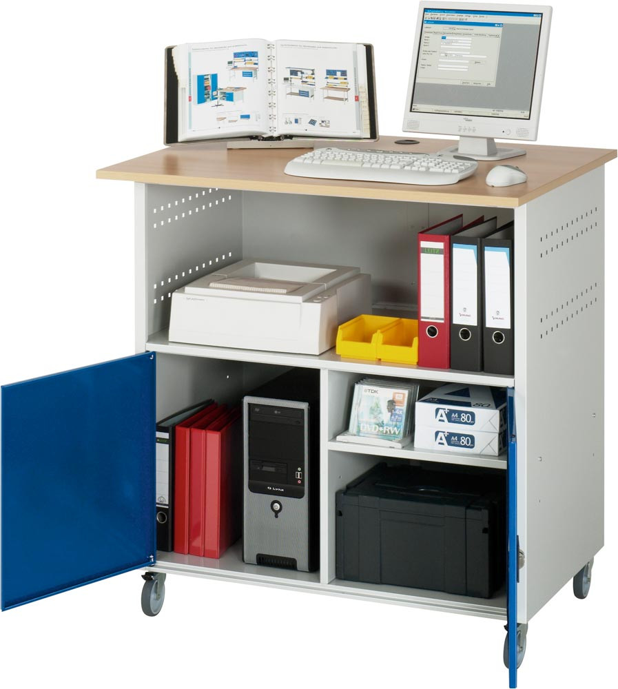 · Buche-Dekor-Arbeitsplatte (Stärke 22 mm) mit Kabeldurchlass ·Basisschrank (B x T x H 1100 x 630 x 1035 mm) oben mit offenem Ablagefach (H 415 mm) und unten mit Flügeltürfach (H 550 mm mit Doppel-Flügeltür, Öffnungsweite ca. 100°, abschließbar) inkl. auszieh- und höhenverstellbaren Einbauelementen (Tragkraft 20 kg, Auszug 80%) · Kabeldurchlässe sowie Energieleiste mit 4 Dosen und Anschlußkabel · Optional mit Monitorgehäuse lieferbar · Wahlweise stationär mit 4 Standrohren inkl. Verstellgleitern oder mobil mit 4 Lenkrollen, davon 2 mit Feststeller, Rollen-Ø 100 mm
