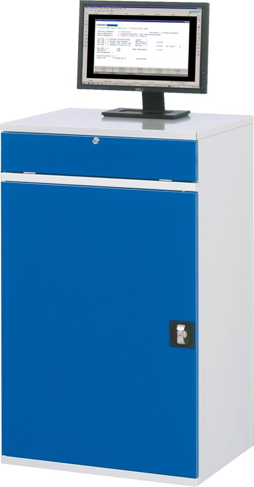 EDV-Schrank, BxTxH 650x520x1060 mm, 1 Auszugboden, 1 Tastenfach m. Klappdeckel, 1 Flügeltüre, RAL 7035/5010, stationär