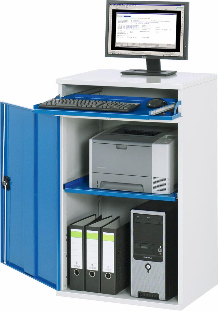 EDV-Schrank, BxTxH 650x520x1060 mm, 1 Auszugboden, 1 Tastenfach m. Klappdeckel, 1 Flügeltüre, RAL 7035/5010, stationär E869166