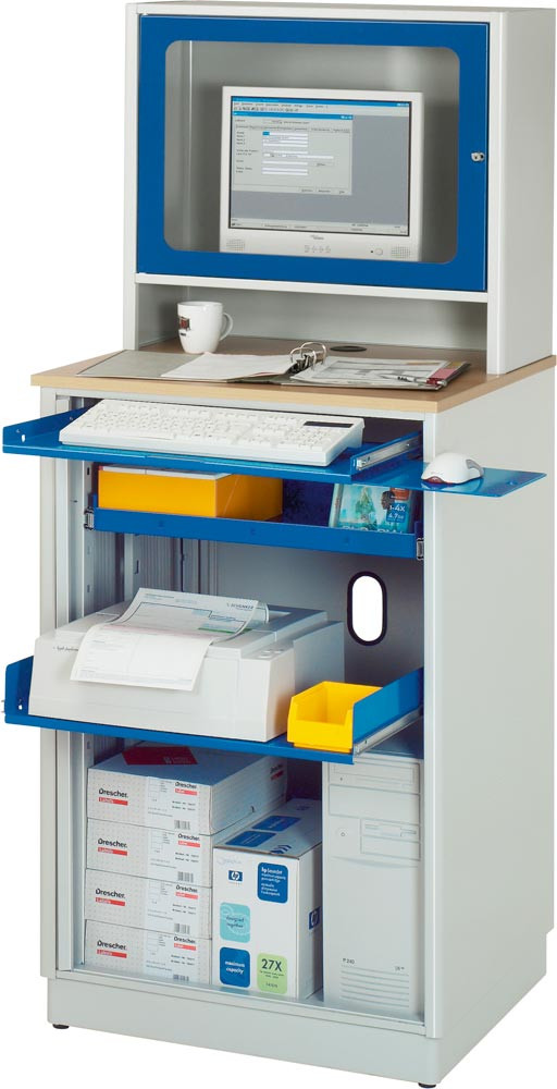 ∙ Buche-Dekor-Arbeitsplatte 25 mm stark, mit gerundeten Ecken und Kanten sowie einem Kabeldurchlass mit Abdeckplatte ∙ Das Unterbaugehäuse ist geteilt und verfügt sowohl im oberen als auch im unteren Bereich über einen jeweils separat zu öffnenden und abschließbaren Rollladen sowie eine 4-fach Energieversorgung inklusive Zuleitung und Kabeldurchlass an der Gehäuserückseite ∙ Oberer Bereich mit ausziehbarer Tastaturschublade BxT 350 x 590 mm, inklusive links oder rechts ausziehbarer Mausauflage BxT 350 x 250 mm ∙ Unterer Bereich mit Ausziehschublade, Auszugboden und Ablageboden - Ausziehschublade und Auszugsboden sind in der Höhe verstellbar ∙ Wahlweise stationär mit verstellbaren Füßen zum Ausgleichen von Bodenunebenheiten oder fahrbar mit 2 Lenk- und 2 Bockrollen ∙ Optional mit Monitorgehäuse lieferbar (Beschreibung siehe unten) ∙ Umweltfreundliche Pulverbeschichtung: Gehäuse RAL 7035 lichtgrau, Einbauten RAL 5010 enzianblau