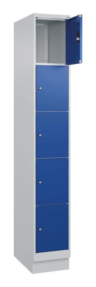 Fächerschrank, BxTxH 300x500x1950 mm, 1x5 Fächer, Abt.B 300 mm, Sockel, Schloss, glatte Türen, RAL 7035/5010 E6479372
