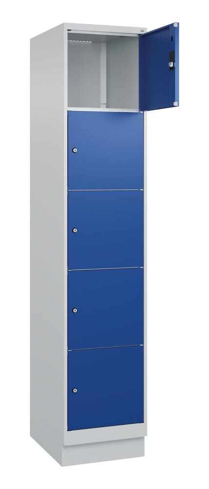 Fächerschrank, BxTxH 400x500x1950 mm, 1x5 Fächer, Abt.B 400 mm, Sockel, Schloss, glatte Türen, RAL 7035/5010 E6479375