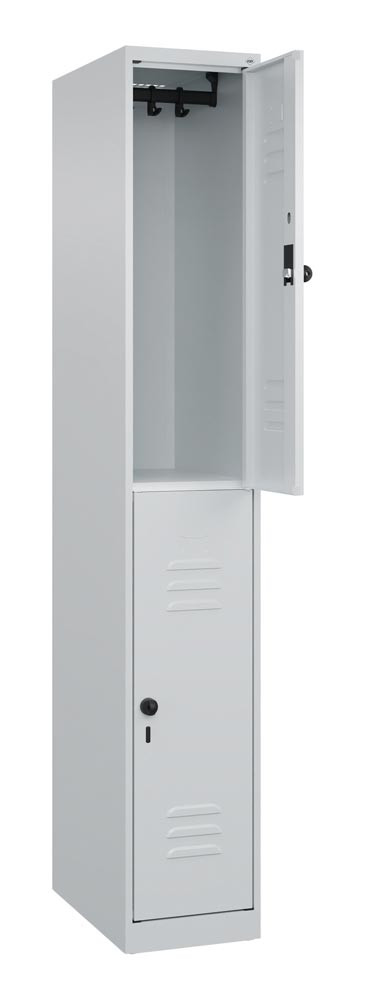 Fächerschrank, doppelstöckig, BxTxH 300x500x1850 mm, 1x2 Fächer, Abt.B 300 mm, Drehriegel, bodenstehend, RAL 7035