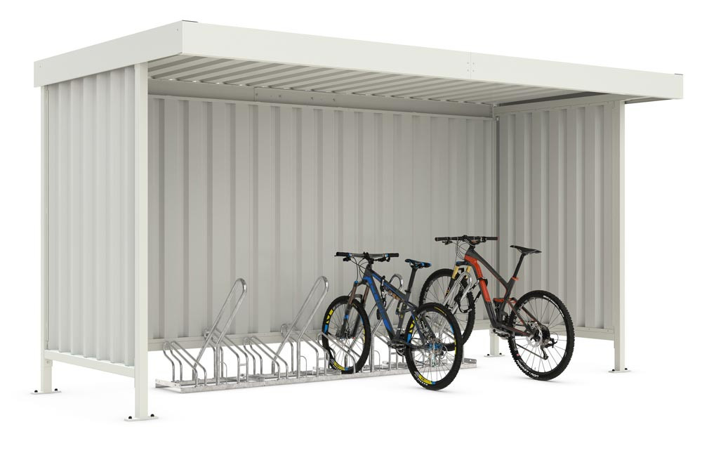 ∙ Inklusive 4 Fahrradständern und Rück- und Seitenwänden ∙ Acht Anlehnplätze ∙ Montagefreundliches Komplett-Set mit langlebiger Flachdachkonstruktion ∙ Hochwertige Stahlkonstruktion mit verzinkten und pulverbeschichteten Bauteilen ∙ Die Entwässerung erfolgt frei abtropfend ∙ Montagefreundlicher Bausatz mit Fundament- und Montageplan, sowie passendem Edelstahl-Besfestigungsmaterial