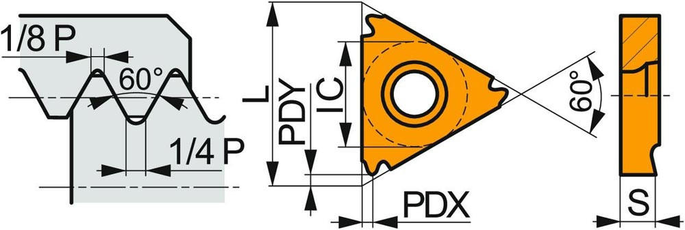 Einseitige Gewindedreh-Wendeschneidplatte · dreieckig mit einem Innenkreisdurchmesser von 6.35mm · für rechtsschneidende Werkzeuge für ISO-metrisches Innengewinde mit 2mm Steigung · T8010 PVD beschichtet extra feinkörniges WC-Co Hartmetall innerhalb der ISO-Substrats-Bereiche P05-P15/M01-M15 und K05-K15 zum zerspanen von Stahl · Edelstahl und Guss
