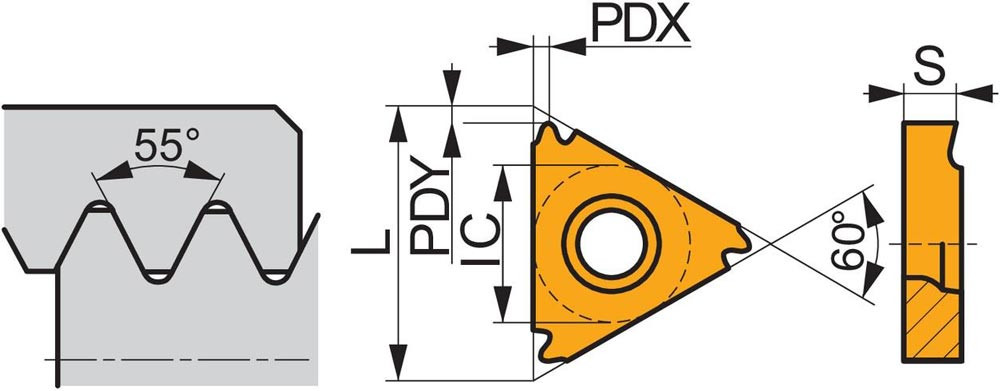 Einseitige Gewindedreh-Wendeschneidplatte · dreieckig mit einem Innenkreisdurchmesser von 9.525mm · für rechtsschneidende Werkzeuge Teilprofil für British Standard Außengewinde mit 48 bis 8TPI · T8030 PVD beschichtet feinkörniges WC-Co-Hartmetall innerhalb der ISO-Substrats-Bereiche P25-P40/M20-M35 und K20-K40 zum zerspanen von Stahl · Edelstahl und Guss