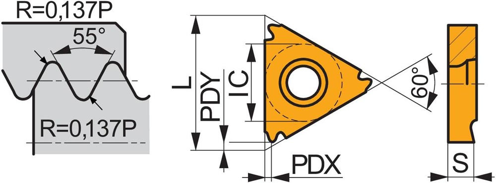 Einseitige Gewindedreh-Wendeschneidplatte · dreieckig mit einem Innenkreisdurchmesser von 9.525mm · für rechtsschneidende Werkzeuge für BSW-Innengewinde mit 14TPI · T8030 PVD beschichtet feinkörniges WC-Co-Hartmetall innerhalb der ISO-Substrats-Bereiche P25-P40/M20-M35 und K20-K40 zum zerspanen von Stahl · Edelstahl und Guss