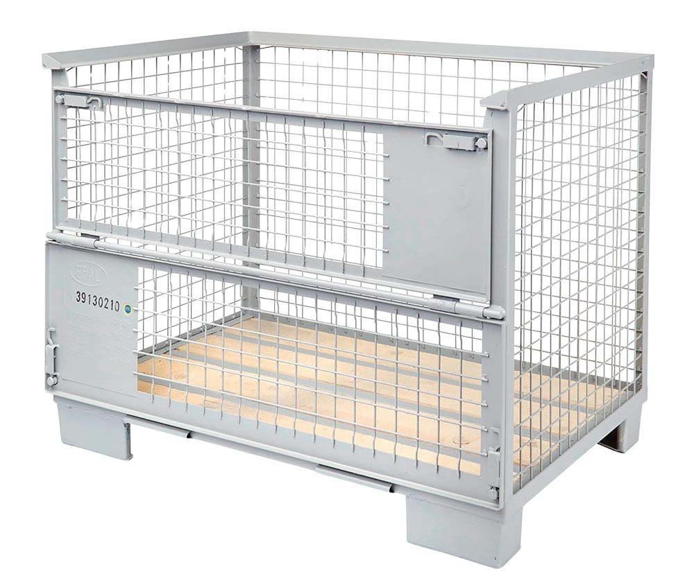 Gitterbox-Palette nach DIN 15155 und UIC-Merkblatt 435-3, hohe Bauform, 1 Längswand mit 2 Klappen, RAL 7030 steingrau, LxBxH 1240x835x970 mm