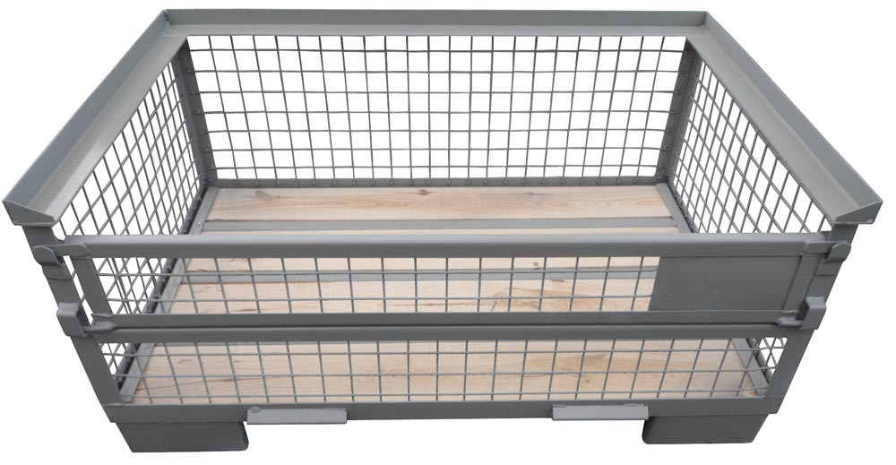 · Rahmen aus Winkeleisen · Seitenwände mit Drahtgitter 50 x 50 x 4,0 mm · Boden mit Stahlunterzügen und Massivholzeinlage · Füße aus Kastenprofil · Unterfahrhöhe 100 mm · Lackierung in RAL 7030 steingrau · Maximale Stapelanzahl: 4 Stück · Trag- und Auflastangaben sind Maximalwerte und gelten bei gleichmäßig verteilter Last