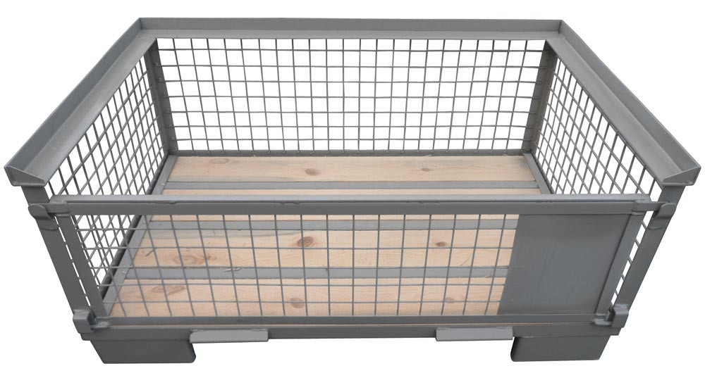 · Rahmen aus Winkeleisen · Seitenwände mit Drahtgitter 50 x 50 x 4,0 mm · Boden mit Stahlunterzügen und Massivholzeinlage · Füße aus Kastenprofil · Unterfahrhöhe 100 mm · Lackierung in RAL 7030 steingrau · Maximale Stapelanzahl: 4 Stück · Trag- und Auflastangaben sind Maximalwerte und gelten bei gleichmäßig verteilter Last