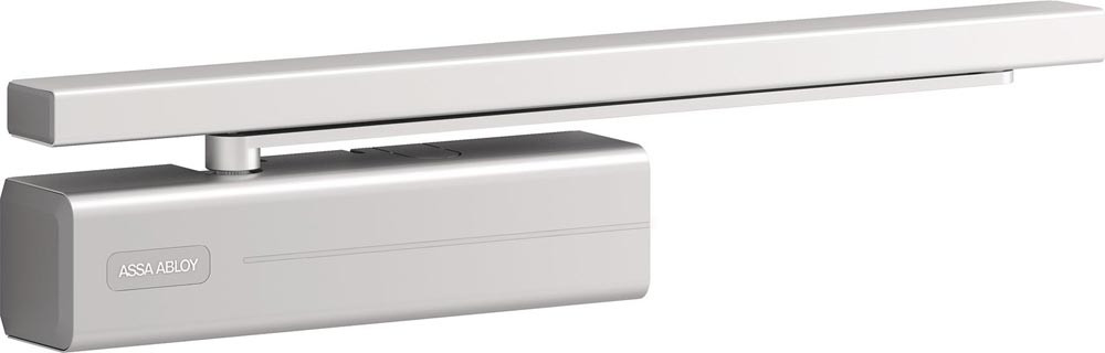 Obenliegender Türschließer mit Cam-Motion® Technologie · geprüft nach DIN EN 1154 · erfüllt die Anforderung nach DIN SPEC 1104 durch stark abfallendes Öffnungsmoment · mit Montageplatte für Feuer- und Rauchschutztüren verwendbar · max. Höhenausgleich stufenlos 14 mm · Schließkraft stufenlos einstellbar · Schließgeschwindigkeit, Endschlag und Öffnungsdämpfung stufenlos von vorne einstellbar