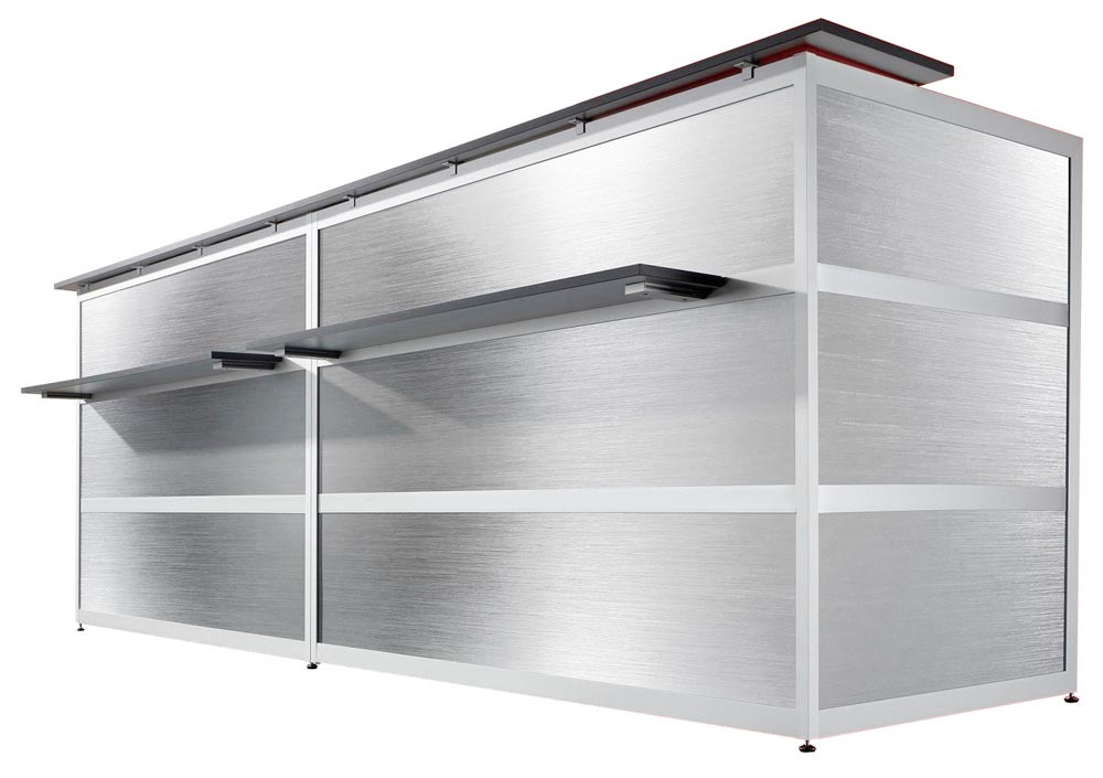 ∙ Alle Thekenelemente mit allseitigem Aluminiumrahmen 25 x 25 mm ∙ Thekenfront in 3-teiliger Optik 46 x 15 mm