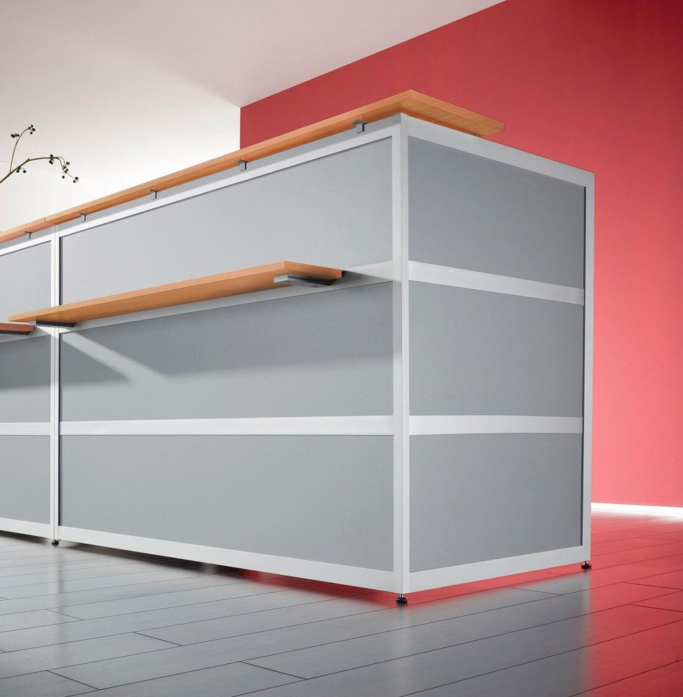 ∙ Alle Thekenelemente mit allseitigem Aluminiumrahmen 25 x 25 mm ∙ Thekenfront in 3-teiliger Optik 46 x 15 mm