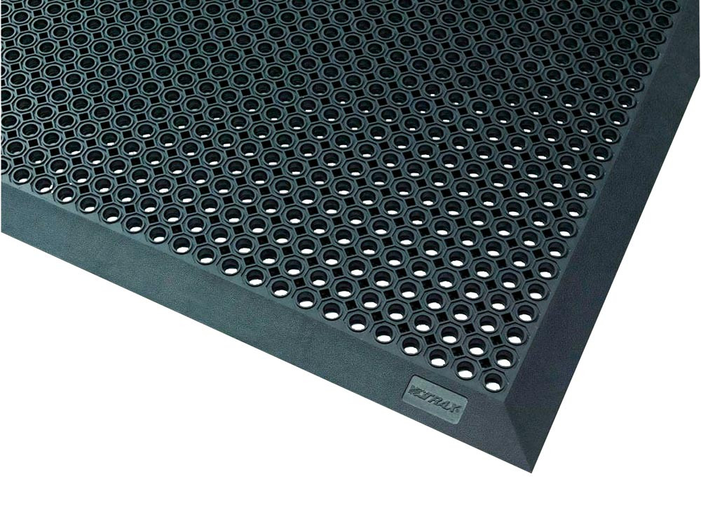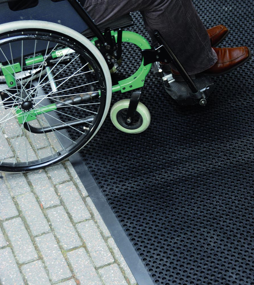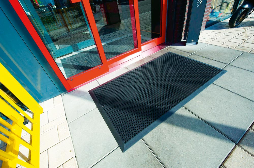 Diese feinmaschigen Gummiwabenmatten sind speziell für den Außenbereich gedacht. Die Wabenkonstruktion lässt Flüssigkeiten schnell abfließen und die Oberfläche bleibt sauber und trocken. Somit sind die Matten ideal für einen stark frequentierten Eingangsbereich. Die Oberfläche der Gummiwabenmatte federt nicht. Durch nur 14 mm kleine Öffnungen sind die Matten außerdem behindertengerecht. Die umlaufende Schrägkante ermöglicht ein sicheres Überqueren mit Rollstühlen, Rollatoren, Koffern etc.