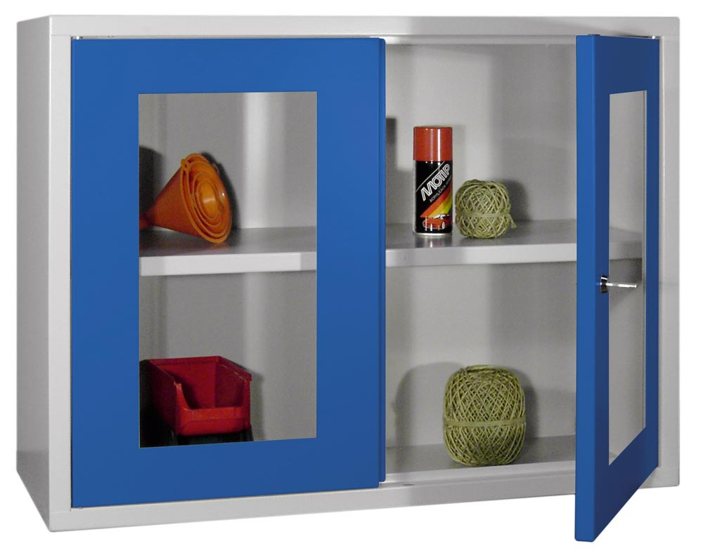 Hängeschrank, 2 Sichtfenstertüren, Rückwand glatt, 1 verstellbarer Boden, Zylinderschloss, BxTxH 800x300x600 mm, RAL 7035/5010