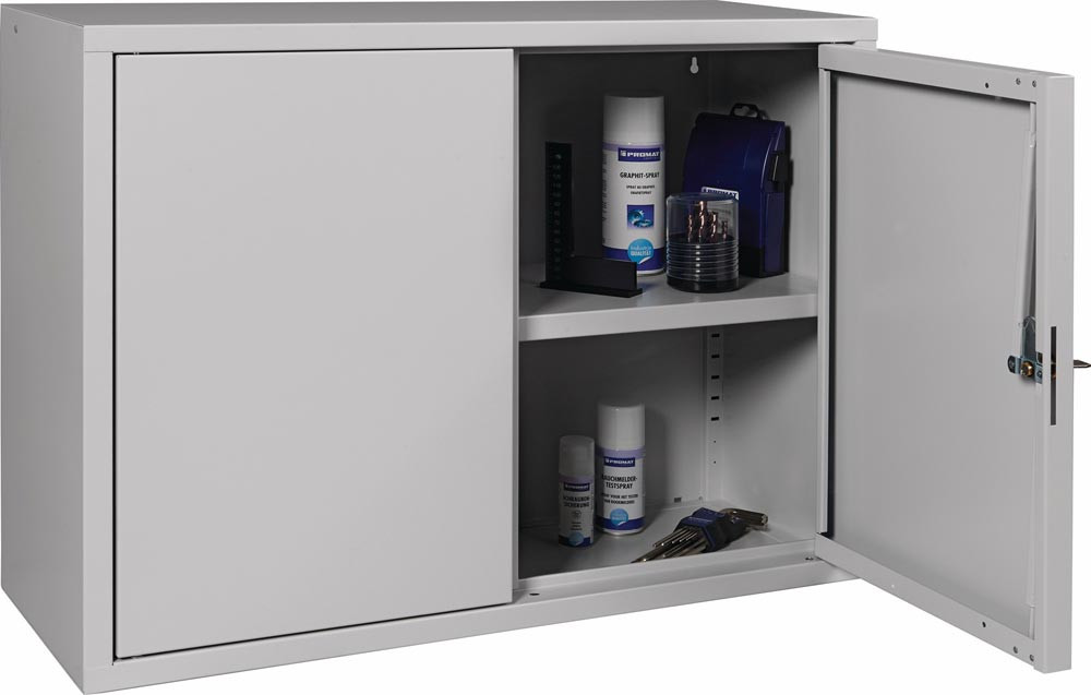 stabile Stahlblechkonstruktion, pulverbeschichtet · Türen aus Vollblech, abschließbar mit Zylinderschloss · Fachboden höhenverstellbar, Tragfähigkeit 15 kg
