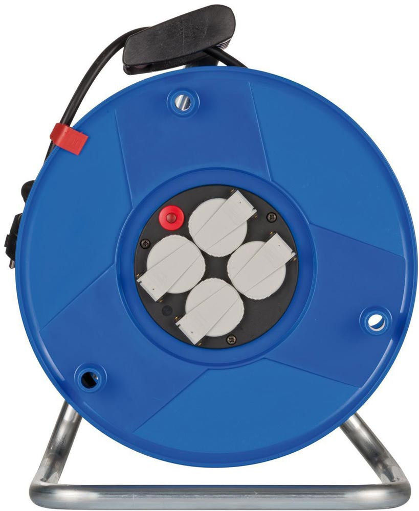 aus Spezialkunststoff auf verzinktem Tragegestell · ergonomischer Handgriff mit Achse für perfekte Kabelführung beim Auf- und Abrollen · 4 Schutzkontakt-Steckdosen mit selbstschließenden Deckeln · Überhitzungsschutz · Kontroll-Leuchten bei Überhitzung und Überlastung · Kunststoffkabel H05VV-F