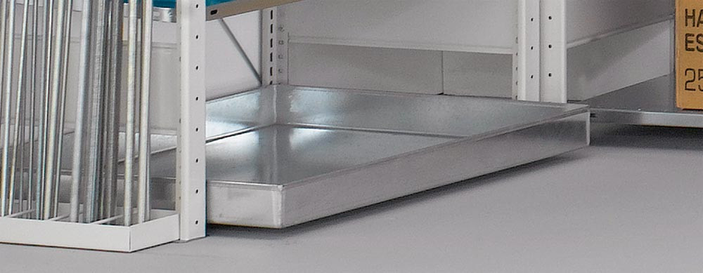 Kleinteile-Regalmodul 1, Grundfeld, BxTxH 1000x500x2000 mm, 4 Böden, 1 Gew.st.halt., 1 Schrägb., 12 Trennbügel, 1 Verr.stange Öllager, 1 Auffangw. E876918
