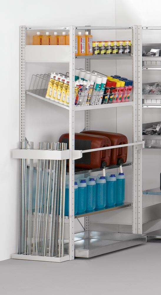 Kleinteile-Regalmodul 1, Anbaufeld, BxTxH 1000x500x2000 mm, 4 Böden, 1 Gew.st.halt., 1 Schrägb., 12 Trennbügel, 1 Verr.stange Öllager, 1 Auffangw.