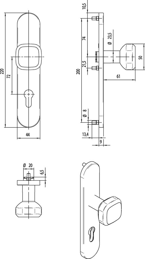 feststehender, viereckiger (abgerundete Ecken), Linsenknopf 3030 · Ausführung gerade · fest auf Langschild 7020 · für Vollblatt-Türen · OGRO-Baukastensystem